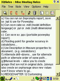 IQNotes v2.0 is now available... No longer freeware, but still definitely worth the price! Now can be used landscape on a SL-C7xx, see here for some pics. Also added a copy and paste feature, the ability to set a default icon for each note type, the choice between horizontal and vertical split screens when viewing the tree and notes simultaneously, the ability to choose between several fonts and font sizes, and a quick add feature that immediately adds a note at the root for quick entry.