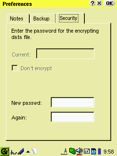 Below are screenshots of the Preferences settings that are available. Notes may be password-protected so that they require a password for access. You can set up a backup location for the data files to be backed up to. Your data files are saved in the /home/zaurus/Applications/iqnotes subdirectory as xml files (unless they are encrypted). I'm backing up the notes on the CF card, so that I can access them on the desktop via a CF card reader.