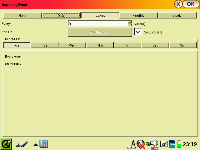 Finally, screen captures of an options setup screen and the various appointment repeat options: