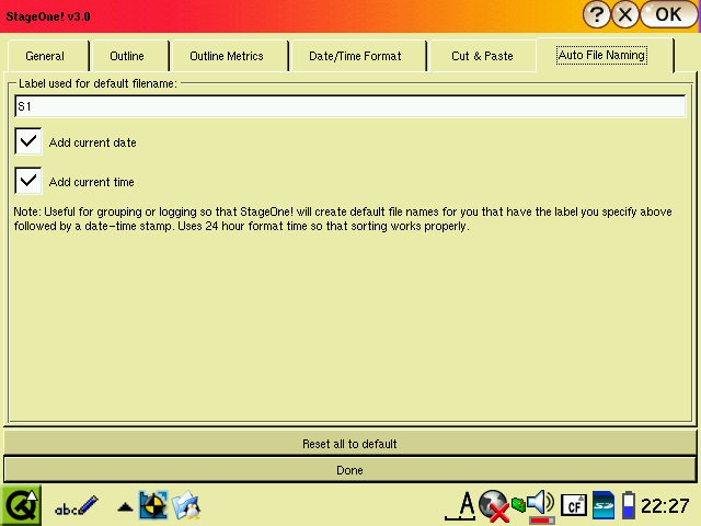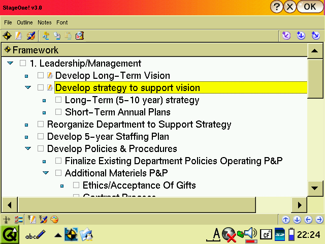 The following screenshots are: first the File selector when StageOne! is launched, and then an outline - fully collapsed, expanded, then showing a note (in two positions), an outline with check boxes, and then the six options setup screens: